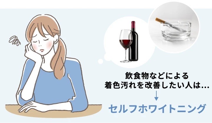 過酸化物を配合した薬物を使用できないセルフホワイトニングは、歯そのものを白くするホワイトニングではなく、歯の表面に付着している着色汚れなどを落とすことで歯本来の色に戻すものになります。